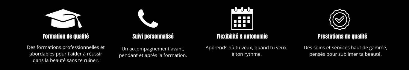 Nos formations esthétiques sont conçues pour t’accompagner pas à pas dans ton lancement. Claires, accessibles et complètes, elles incluent des supports détaillés, des vidéos pratiques et un suivi personnalisé. Avec moi, tu ne seras jamais seule : je reste disponible même après ta formation pour t’aider à avancer. Transforme ta passion en une véritable activité pro !